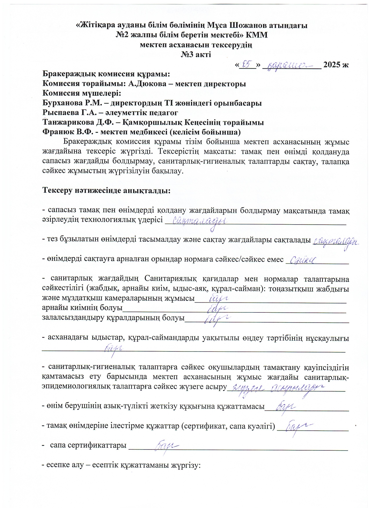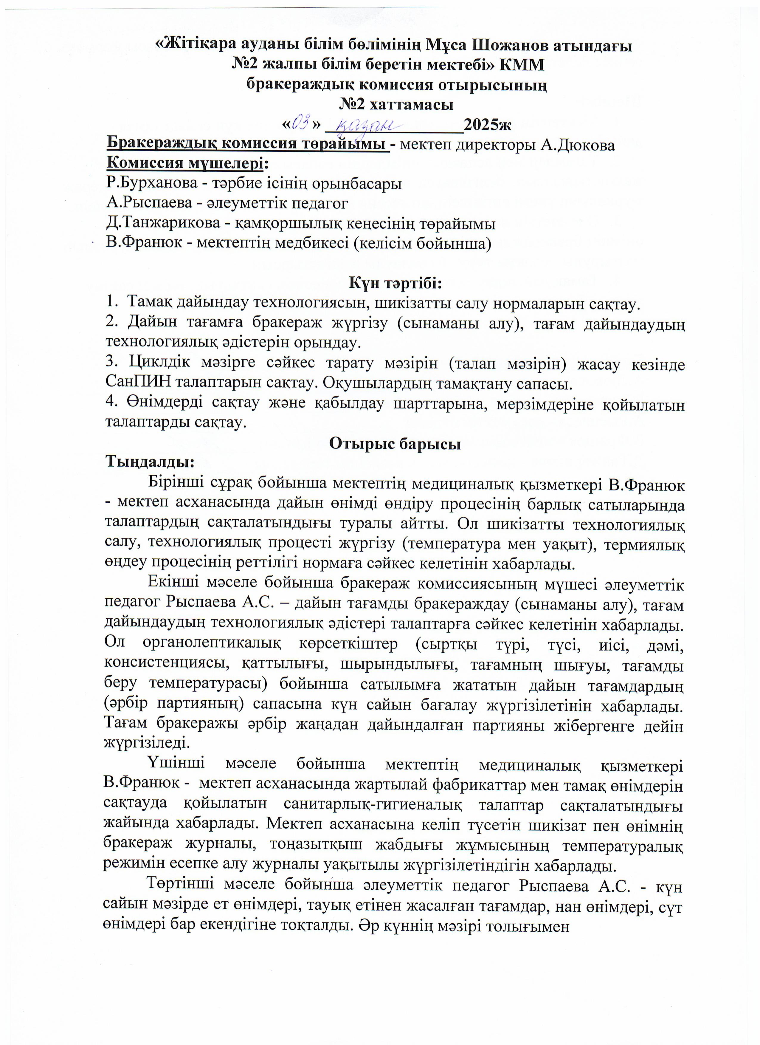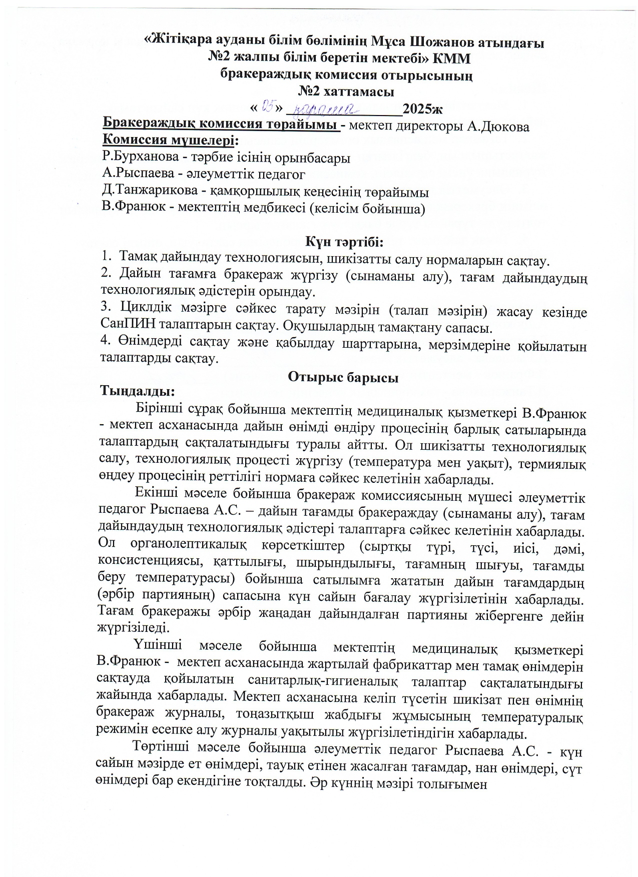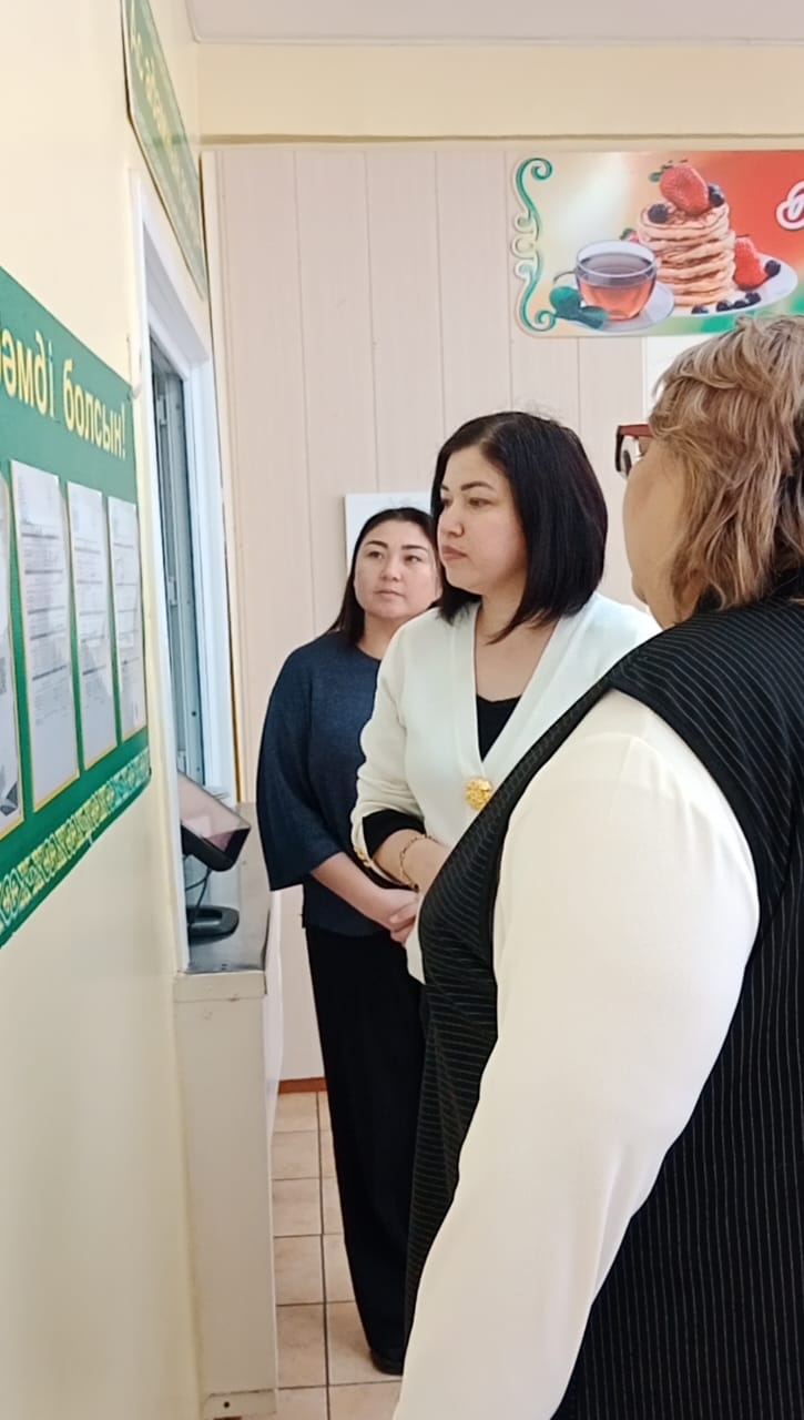 05.11.2025ж жоспарға сәйкес оқушылардың тамақтану сапасын бақылау мақсатында мектебімізде бракераждық комиссия жұмыс жасайды. Бракераждық комиссия құрамындағы Қамқоршылық кеңесінің төрайымы мен ата-аналар қауымдастығының мүшелері жүйелі түрде жұмыс жасайды. Комиссия мүшелері асхана жұмысын тексеріп, тамақтың сапасын, тағам үлесінің салмағын және ас блогының санитарлық жағдайына сынама жасайды. Асханадағы ас мәзірінің уақытылы өзгеруін қадағалайды. Асханада күнделікті әзірленетін тағамдар балғын әрі дәмді. Тексерістің нәтижесі бойынша акт толтырылып, хаттама жасалды.