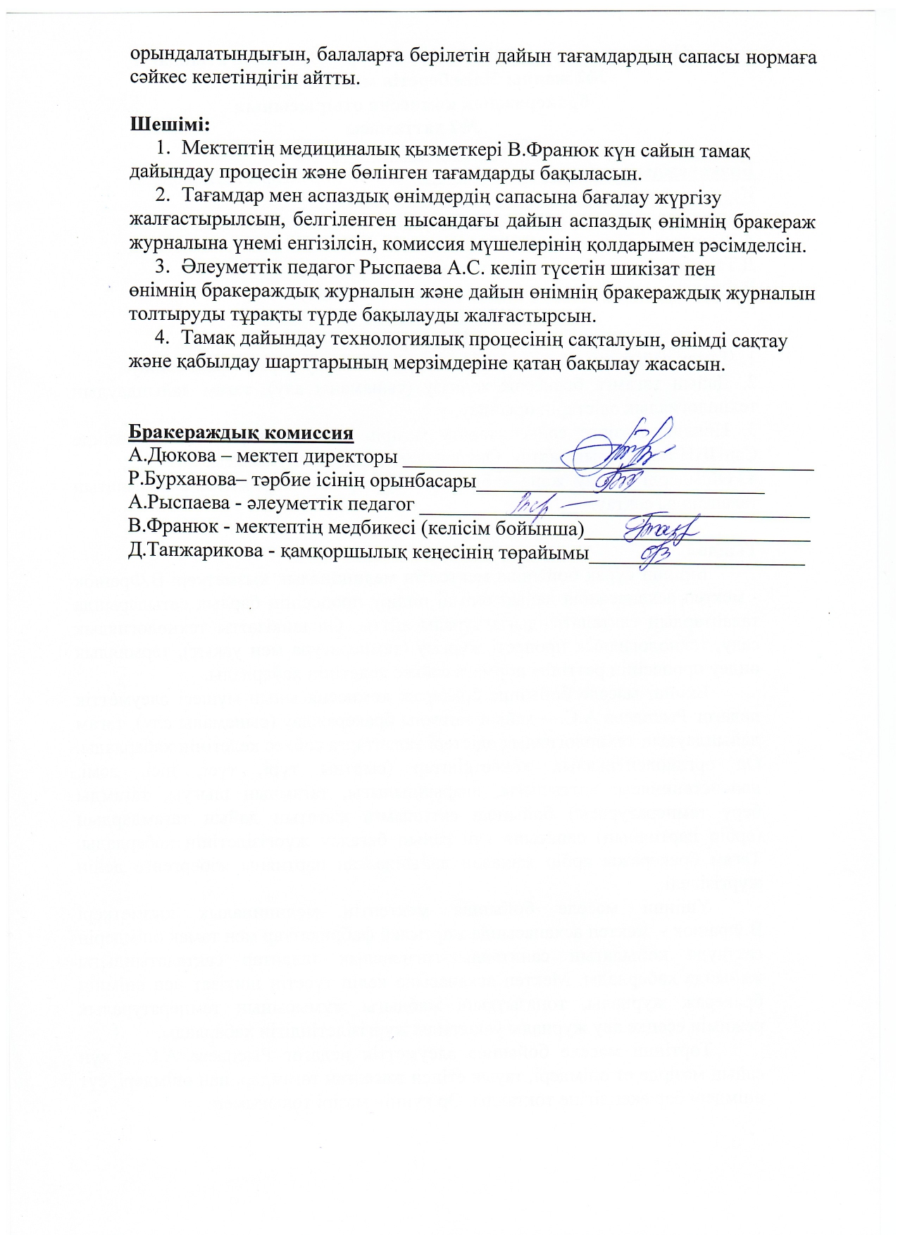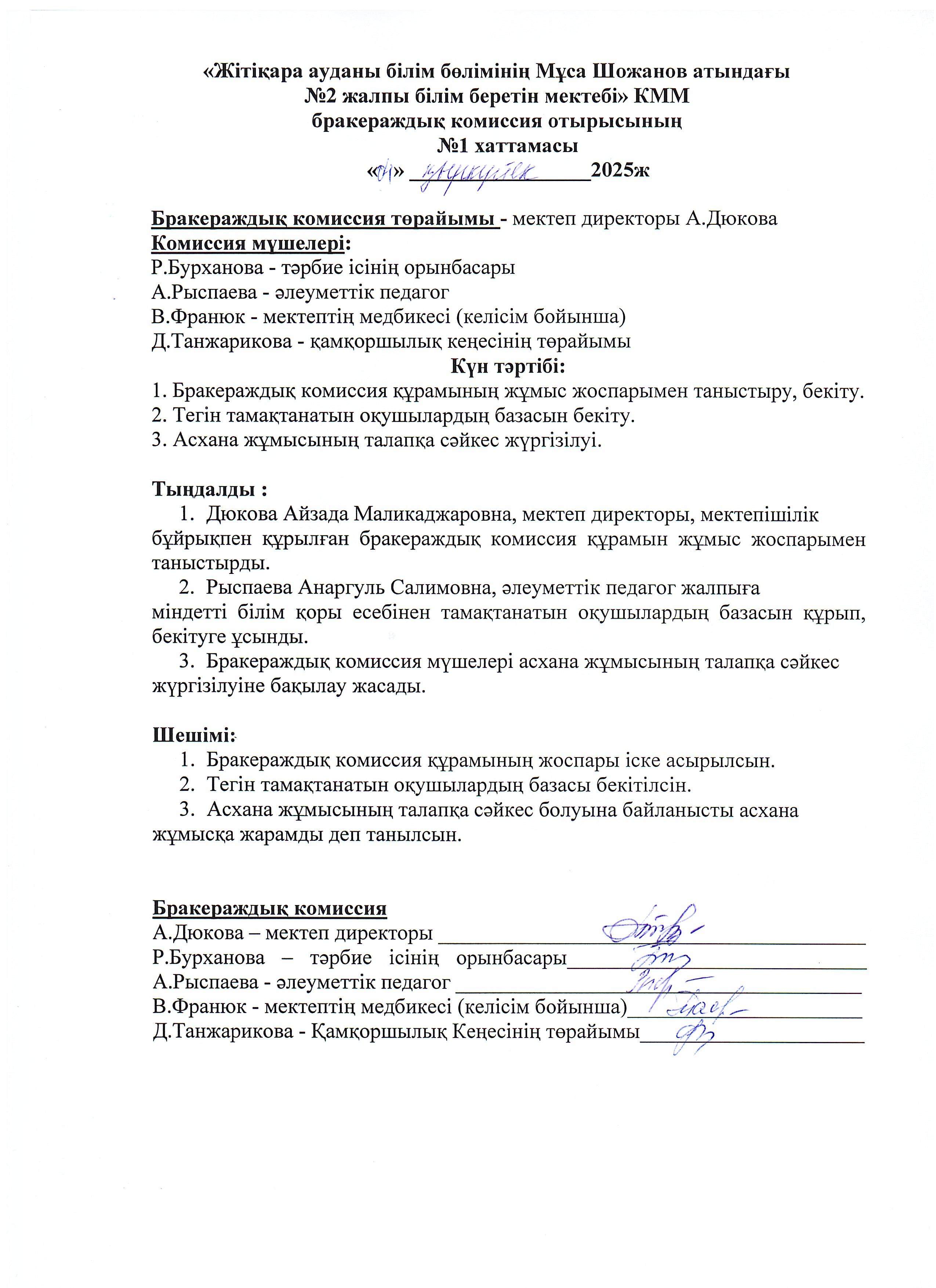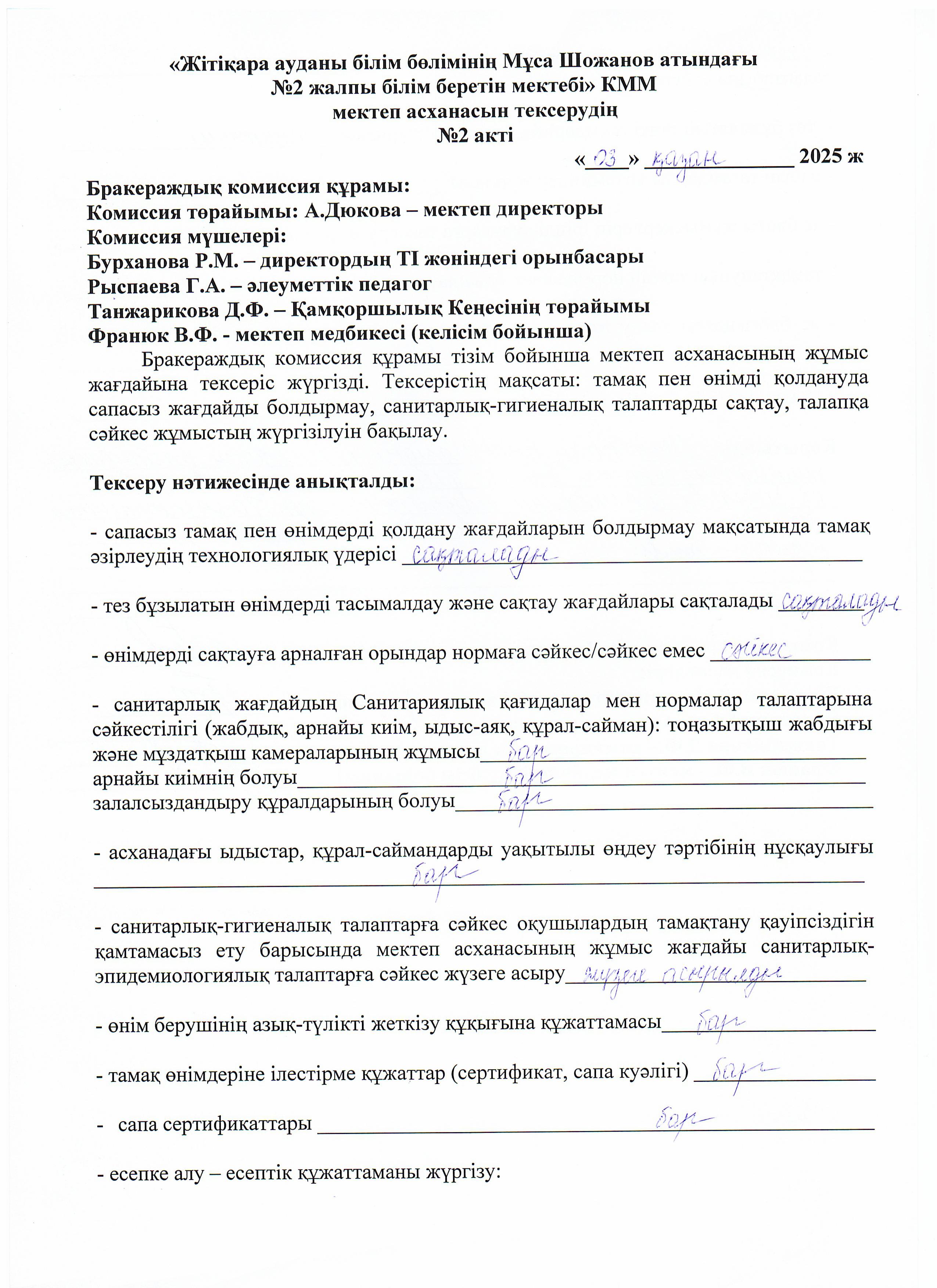 05.11.2025ж жоспарға сәйкес оқушылардың тамақтану сапасын бақылау мақсатында мектебімізде бракераждық комиссия жұмыс жасайды. Бракераждық комиссия құрамындағы Қамқоршылық кеңесінің төрайымы мен ата-аналар қауымдастығының мүшелері жүйелі түрде жұмыс жасайды. Комиссия мүшелері асхана жұмысын тексеріп, тамақтың сапасын, тағам үлесінің салмағын және ас блогының санитарлық жағдайына сынама жасайды. Асханадағы ас мәзірінің уақытылы өзгеруін қадағалайды. Асханада күнделікті әзірленетін тағамдар балғын әрі дәмді. Тексерістің нәтижесі бойынша акт толтырылып, хаттама жасалды.