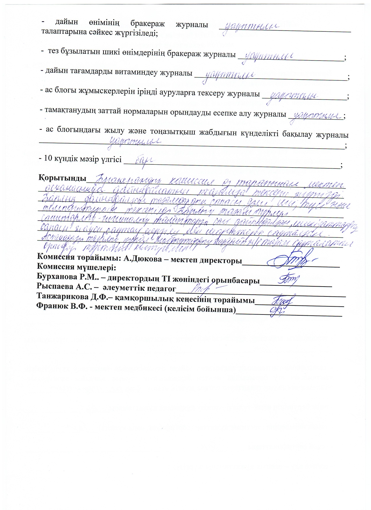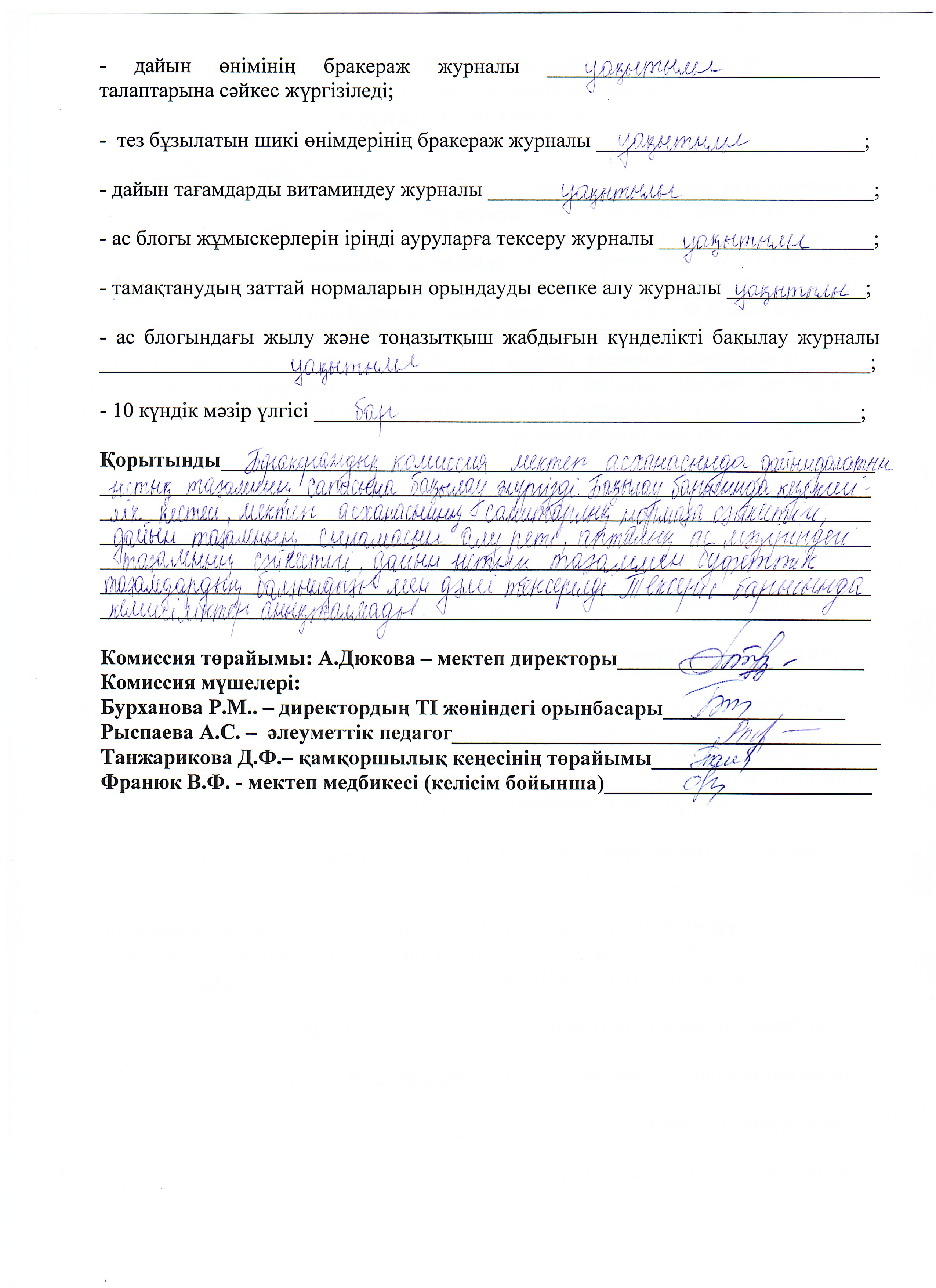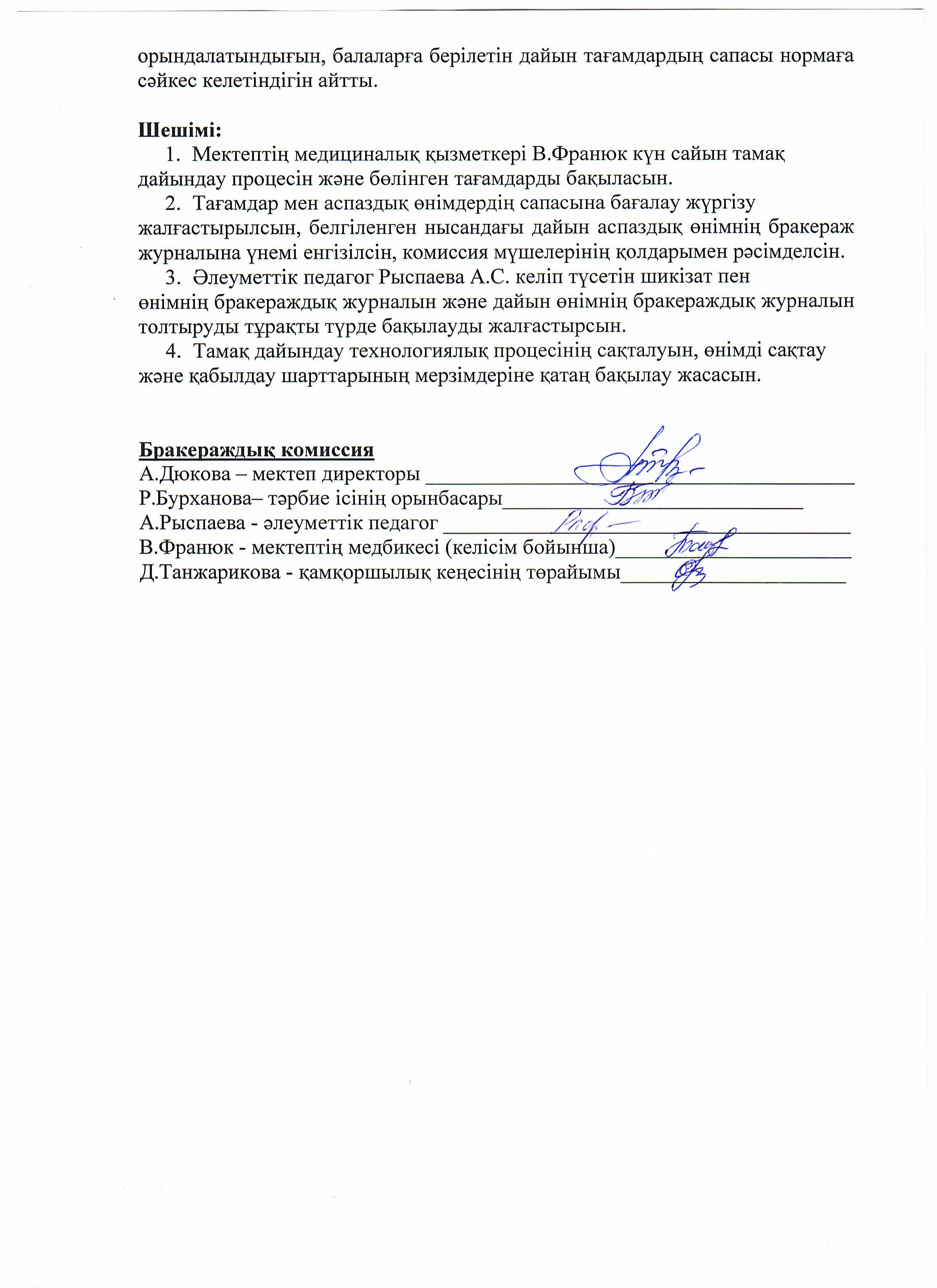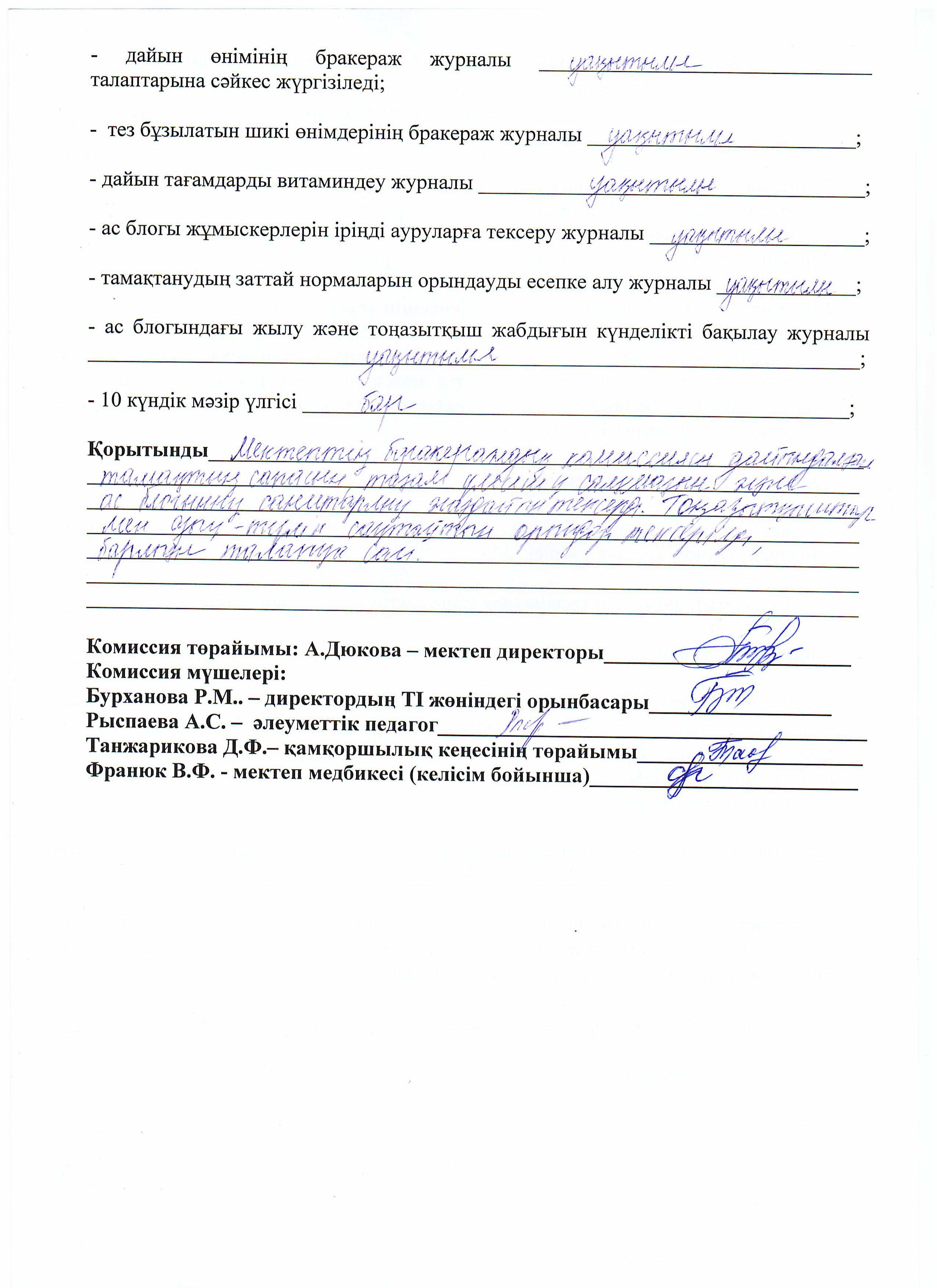 05.11.2025ж жоспарға сәйкес оқушылардың тамақтану сапасын бақылау мақсатында мектебімізде бракераждық комиссия жұмыс жасайды. Бракераждық комиссия құрамындағы Қамқоршылық кеңесінің төрайымы мен ата-аналар қауымдастығының мүшелері жүйелі түрде жұмыс жасайды. Комиссия мүшелері асхана жұмысын тексеріп, тамақтың сапасын, тағам үлесінің салмағын және ас блогының санитарлық жағдайына сынама жасайды. Асханадағы ас мәзірінің уақытылы өзгеруін қадағалайды. Асханада күнделікті әзірленетін тағамдар балғын әрі дәмді. Тексерістің нәтижесі бойынша акт толтырылып, хаттама жасалды.
